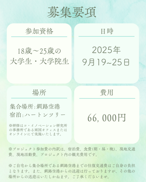 必要経費として、ハートンツリーさんでのご宿泊費用・宿泊施設における食費、現地での観光費用が含まれております。プロジェクト内で用意したもの以外に外食をした場合や釧路空港までの交通費は別途ご負担いただきます。 |