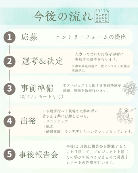- 書類選考を通過した方と、オンラインでプロジェクトの説明会&面談を行います。不安なことや聞きたいこと、何でも話してください!ここで最終的な参加の意思を確認します。