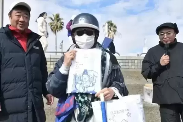 海の恩恵に感謝する海の日に青いサンタクロースの格好をして、未来の子どもたちにきれいな海をプレゼントするというコンセプトのごみ拾い
