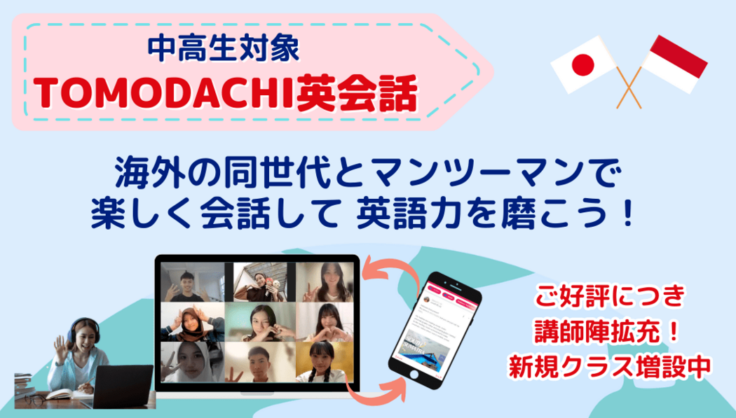 【5月クラスも概ね埋まり満席間近です:中高生対象】英会話が楽しくなる!海外の同世代とマンツーマン交流で英語力UP。毎週60分のオンラインで多文化体験しながら国際感覚を磨くTOMODACHI英会話。