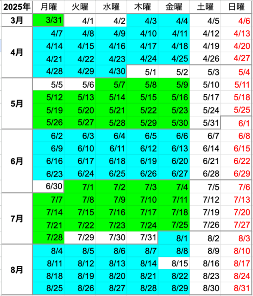 2025年開催日:色がついている日が開催日です。月のレッスンが3回の場合は、授業料の75%のみお支払い頂きます。