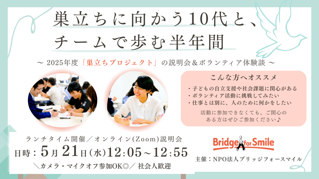 進学や就職を控えた親を頼れない高校生たちと、社会人ボランティアたちが月1回集い、自立の準備を支える半年間。「巣立ちプロジェクト」の魅力と活動のリアルを知れるオンライン説明会をランチタイムに開催します!