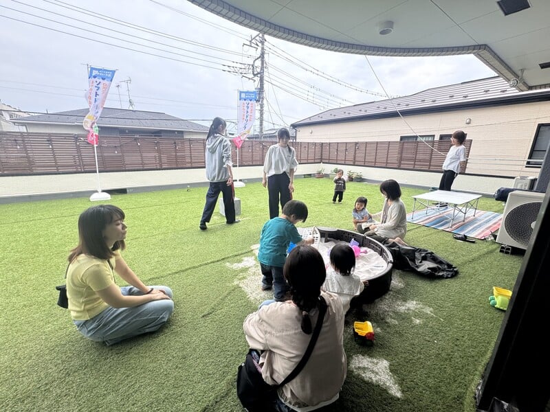 民間の子育て支援施設 みらいLabです。子どもとママのための施設で一緒にボランティアをしていただける方を募集しています。施設には、イベント開催のスタジオ、カフェラウンジ、芝のテラス、砂場、一時託児室有