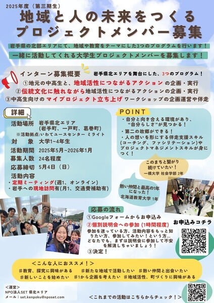 岩手県の北部エリアにて、地域や教育をテーマにした3つのプログラム(伝統文化に触れたり、地元の中高生と一緒にアクションの企画運営や伴走など)を行います!一緒に活動してくれる大学生メンバーを募集します!