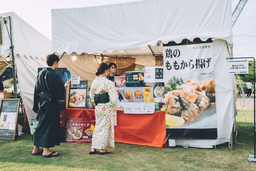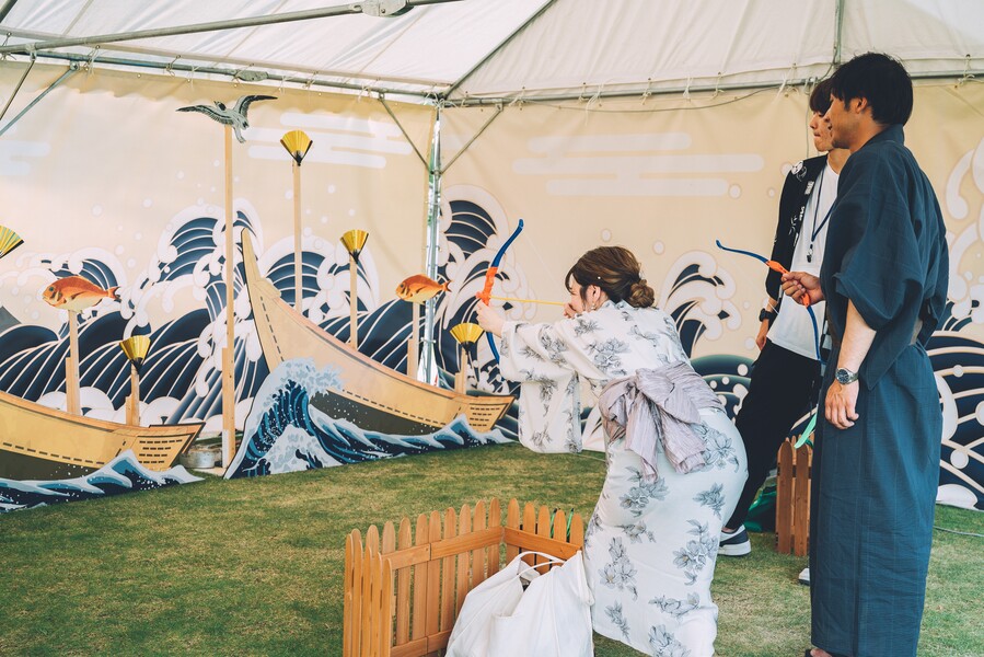会場には、京都ならではの和の雰囲気が広がり、夏ならではのフードやドリンク、縁日が並んだ。