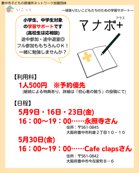 第一回目の学習サポート「マナボ+」が豊中市今在家にあるCafe Clapsさんにて開催されました。