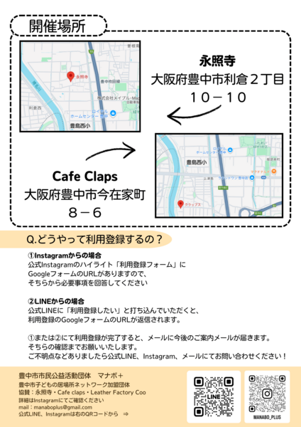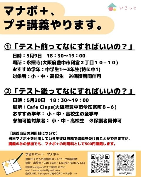 いこっと公式HPにマナボ+の情報が掲載され、豊中市の子どもの居場所一覧に登録されています。