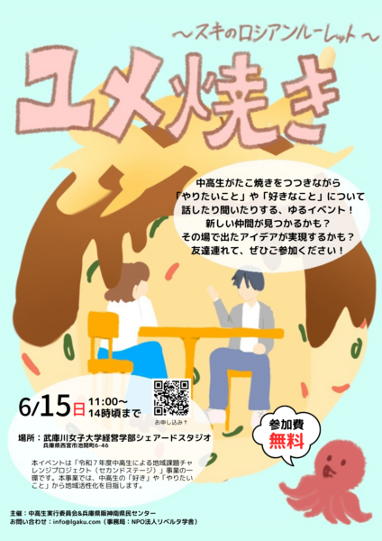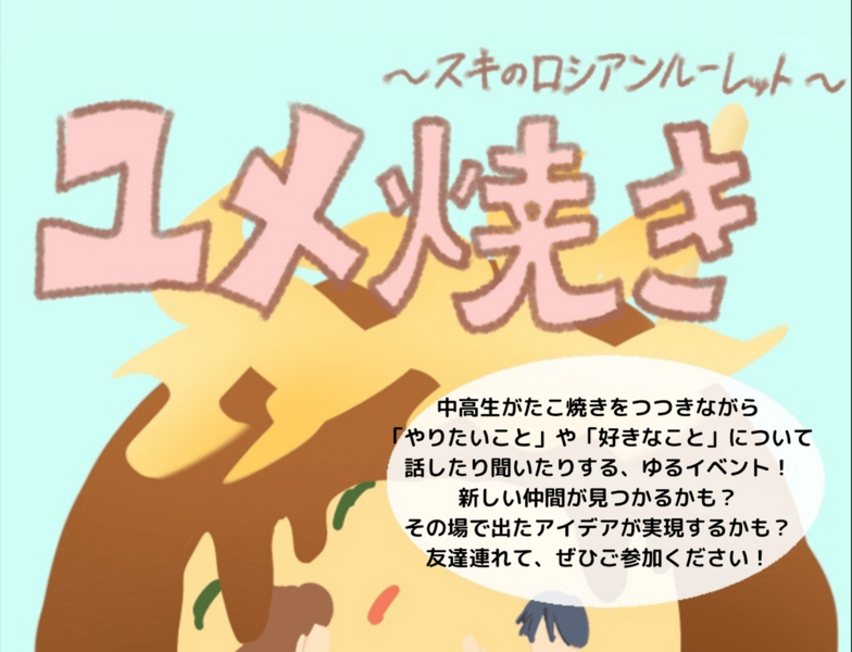 中高生がたこ焼きをつつきながら「やりたいこと」や「好きなこと」について話したり聞いたりする、ゆるイベント!新しい仲間が見つかるかも?その場で出たアイデアが実現するかも?友達連れて、ぜひご参加を!
