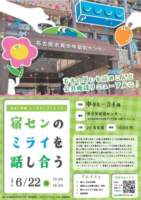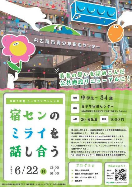 名古屋市緑区にある青少年宿泊センターは青少年の居場所としての役割のほかに宿泊やサークル活動、野外炊飯などができるアクテビティ施設(通称:宿セン)としての役割あります。そんな宿センがリニューアルします。🎉🎉いろいろな利用方法がある宿センが青少年にとってより良い施設になるように「こんな設備があったらいいな。」「こんなことをしてみたい!」など考えを教えてください。