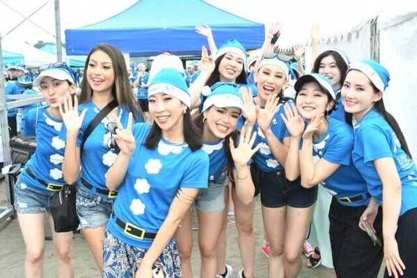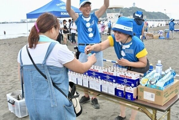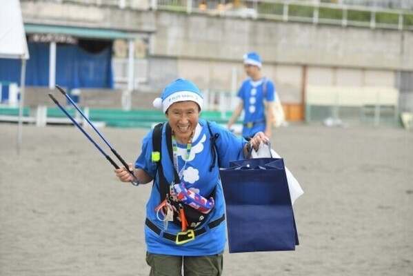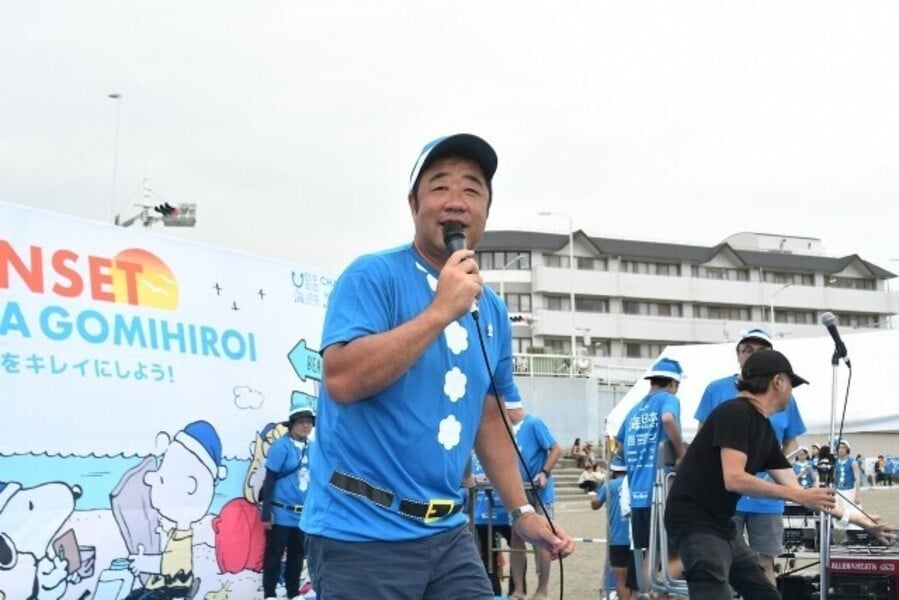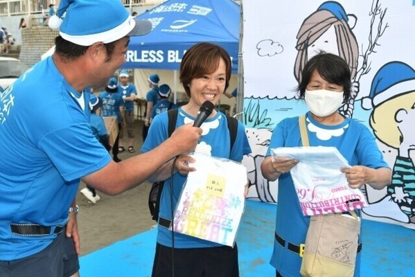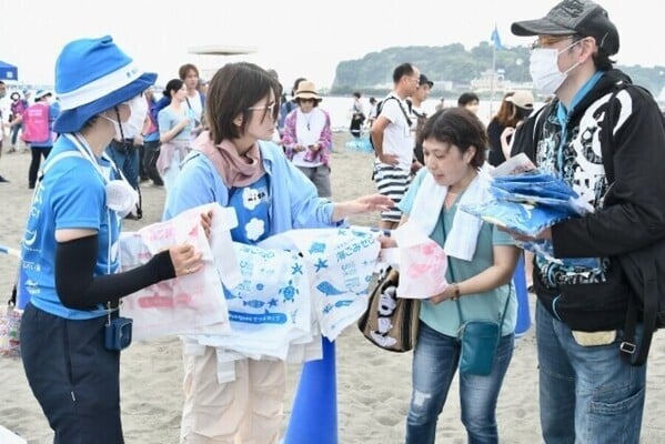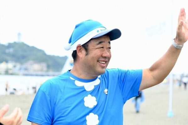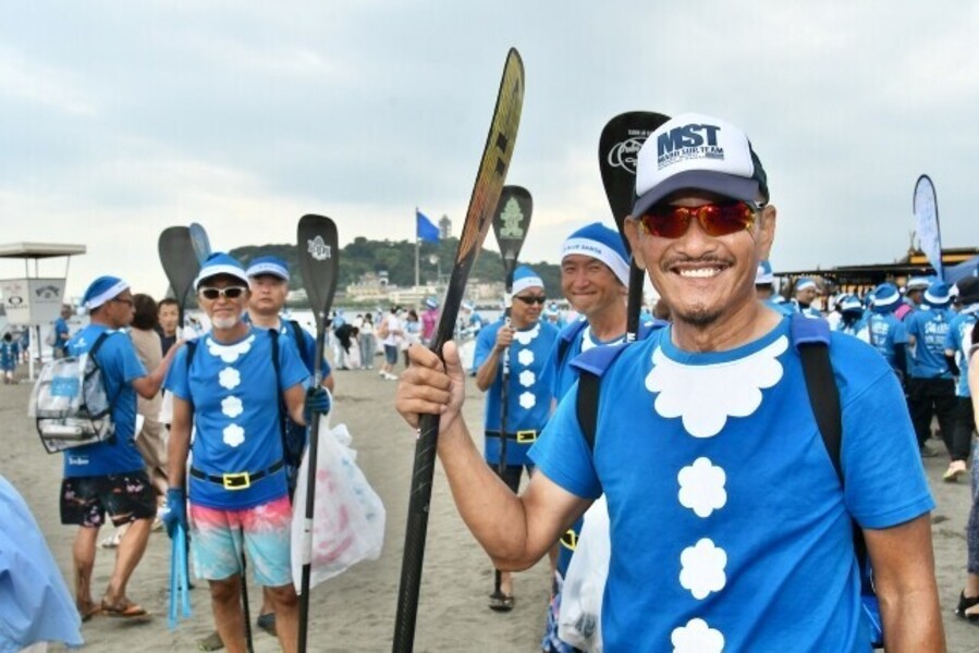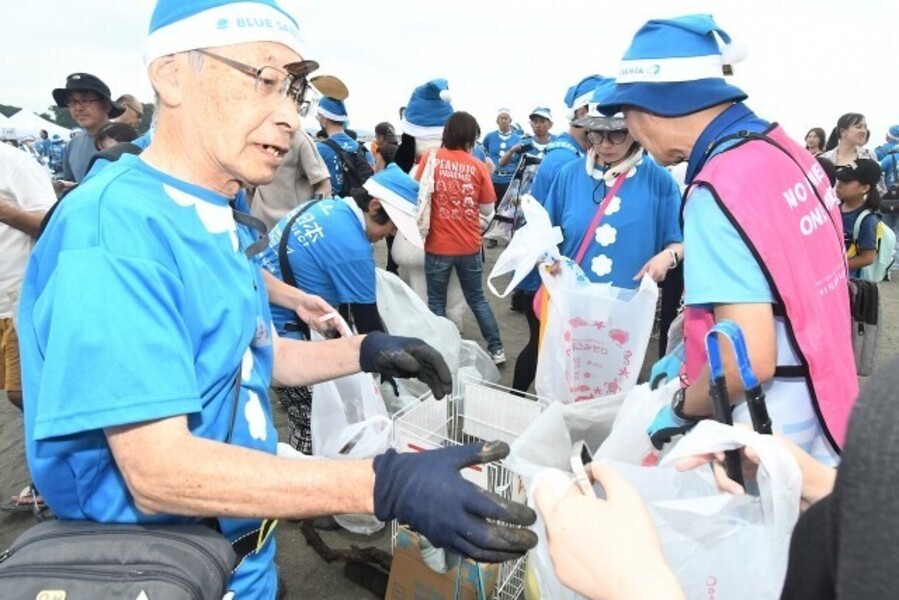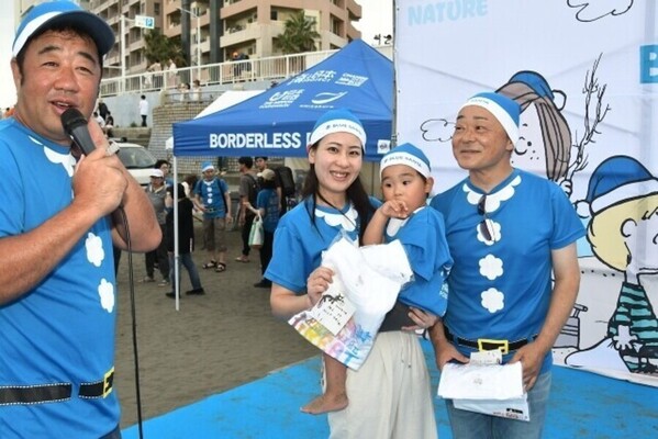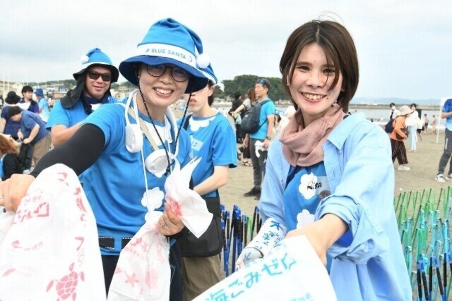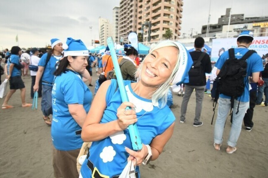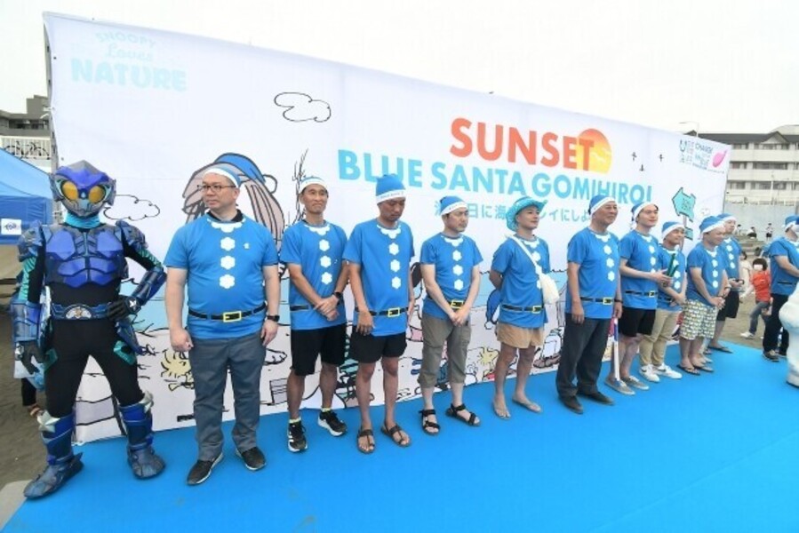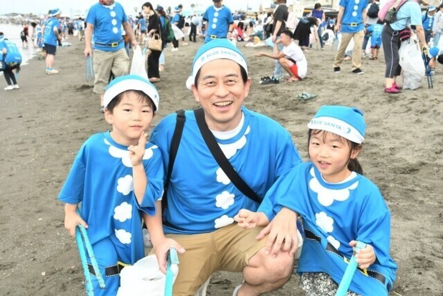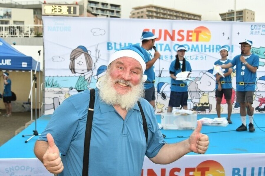 海の恩恵に感謝する海の日に青いサンタクロースの格好をして、未来の子どもたちにきれいな海をプレゼントするというコンセプトのごみ拾い