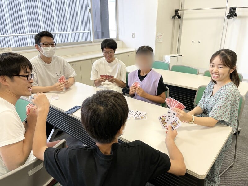 子どもとゲームであそんだり話したりして関わっています。あすのちではみんなで対戦できるボードゲームやお絵描きが人気です。生徒の対象年齢