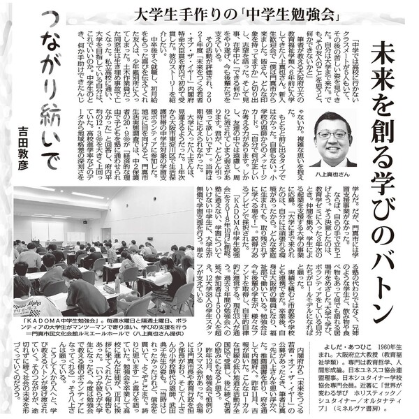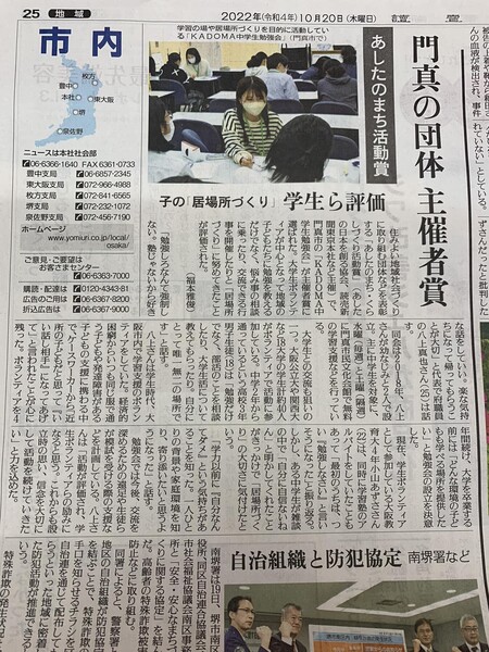 「私は門真にゆかりのない人間ですが、知人の紹介でこの活動に参加させていただきました。この活動に参加することで、勉強できる環境が当たり前でないこと、大学進学が当たり前でないことなど、本当にいろんなことを日々学んでいます。」