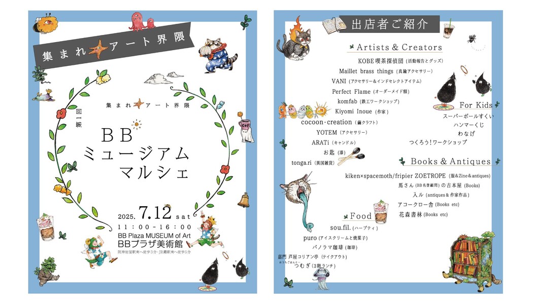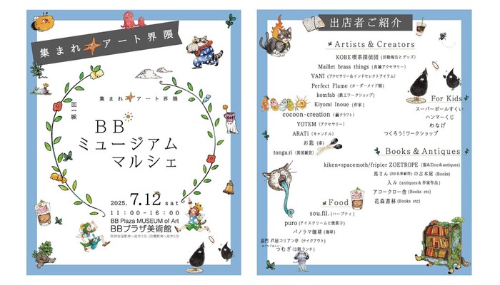 BBプラザ美術館が、大人も子どもも楽しめる1日限りのマルシェを開催。ものづくりに情熱をもつアーティストやクリエイター、個性あふれるお店が出店します。美術館やアートが好きな方、ぜひ一緒に盛り上げて下さい