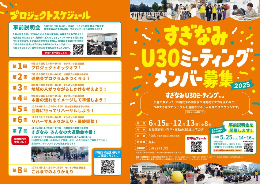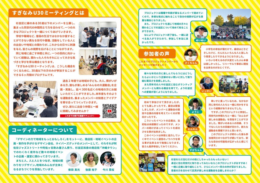 杉並区に縁のある30歳以下のメンバーを公募し、集まった同世代の仲間同士で力を合わせて一つの大きなプロジェクトを達成させる6ヶ月間のプログラム。地域の老若男女すべての方が参加できる運動会を企画・実施!