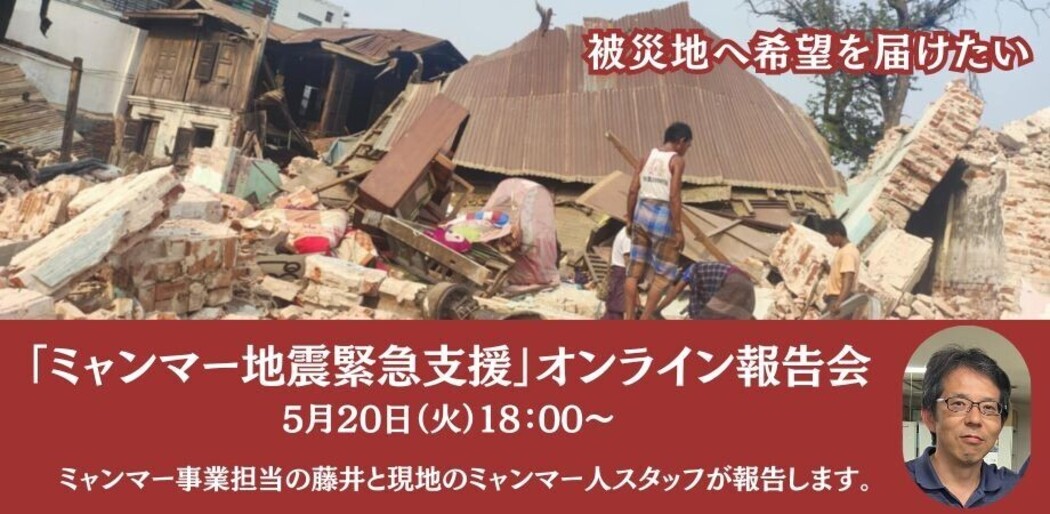 3月28日にミャンマーで発生した地震により多数の建物が倒壊、3700人以上の犠牲者が出ています。本報告会では現地の状況や支援活動についてミャンマー事業担当者と現地のミャンマー人スタッフより報告します。
