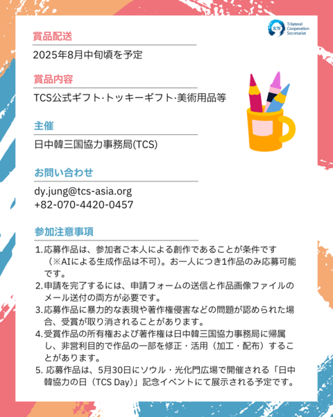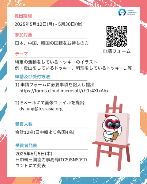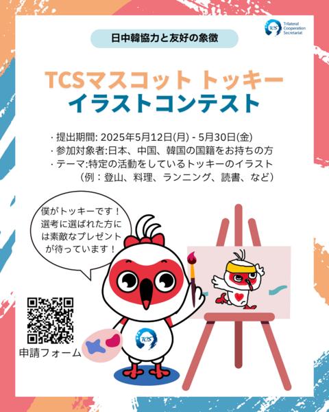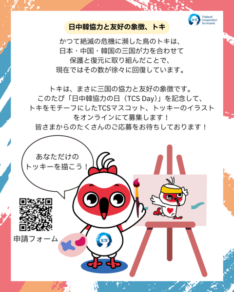 このたび「日中韓協力の日(TCS Day)」を記念して、トキをモチーフにしたTCSマスコット、トッキーのイラストをオンラインにて募集します!