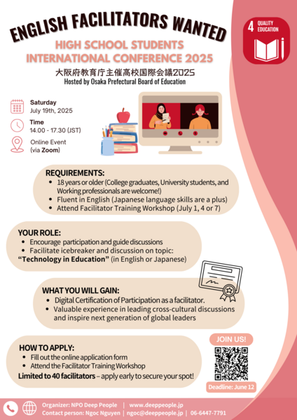 オンライン高校生国際会議でのSDGsに関するディスカッションをファシリテーターとして、英語が堪能な日本人、または外国人の方を募集しております。