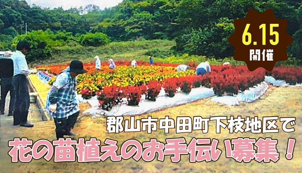郡山市中田町下枝地区で花の苗植えを行います。地域の美化活動として、景観を良くするべく5000本の苗を植える作業です。地域を鮮やかに彩る作業にぜひご参加ください。