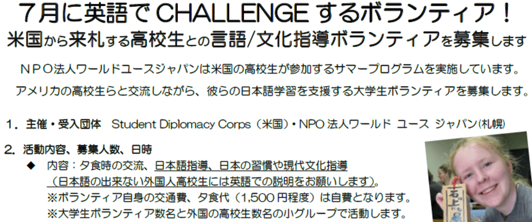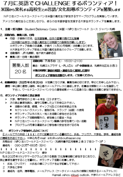 募集人数:20名場所:札幌市内日時:2025年7月5日(土)16:00~21:00