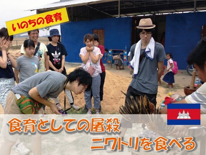 食育を栄養バランスの側面だけでなく、「命の授業」と捕らえ、カンボジアの地鶏を屠殺し、解体、調理ののち「料理」になるまでの一連を体験してもらいます。人間が食べている食材は、ほぼ全て命のあった物です。それを再認識する場として命を頂くランチをプランに組み込んでいます。
