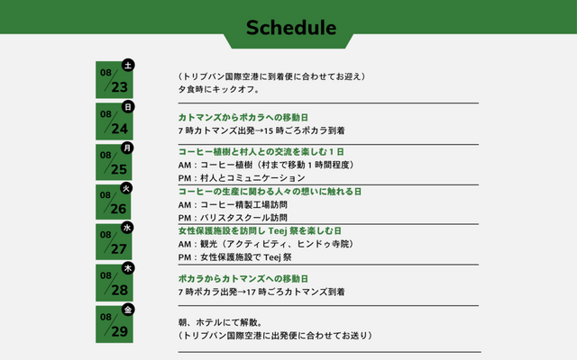 | 現地係員 | BIKAS COFFEE日本人スタッフ2名 現地スタッフ1名(日本語話者) |