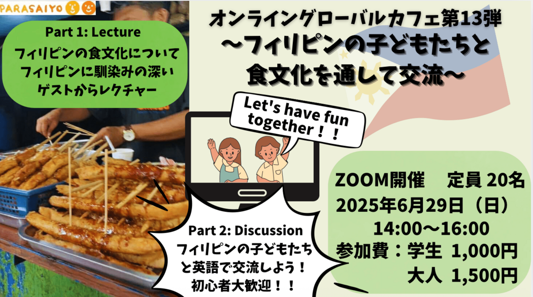 今回のテーマは食!フィリピンの食文化を学び、フィリピンの子どもたちと英語で交流できる120分となっております!