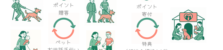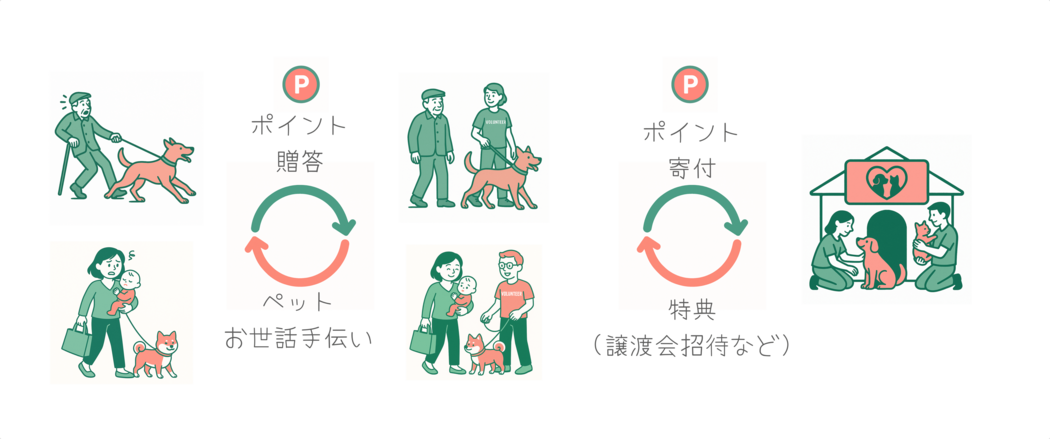 地域の高齢者や困っている方のペットをお散歩やお世話し、その対価が1円1pt制で動物保護施設への寄付に変わり、ボランティアの方には施設の「ふれあい券」など特典がもらえる循環システムです!