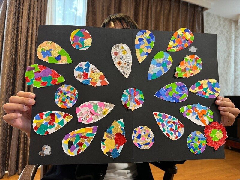 外国人留学生と日本人運営メンバーが協力しながら、さまざまな種類の折り紙を作り、花束を模した台紙にぺたぺたと貼り付けて最後には美しい花束を完成させるというワークショップです!
