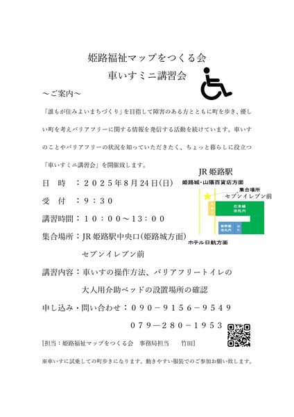 姫路市内の町を障害のある方共にバリアフリーに関する情報発信活動に取り組んでいます。8/24日㈰10:00~13:00に暮らしに役立つ車いすの操作方法などの講習を行います。