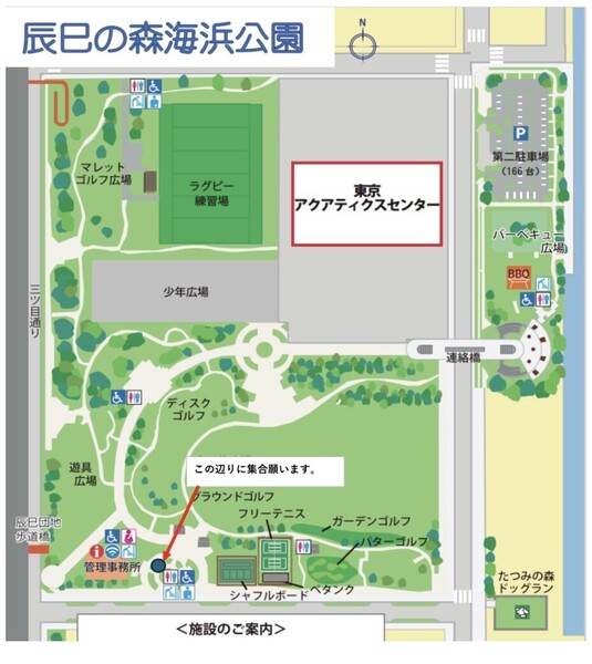 9:10に 辰巳の森海浜公園管理事務所前に集合ください(詳細は地図をご参照ください) |