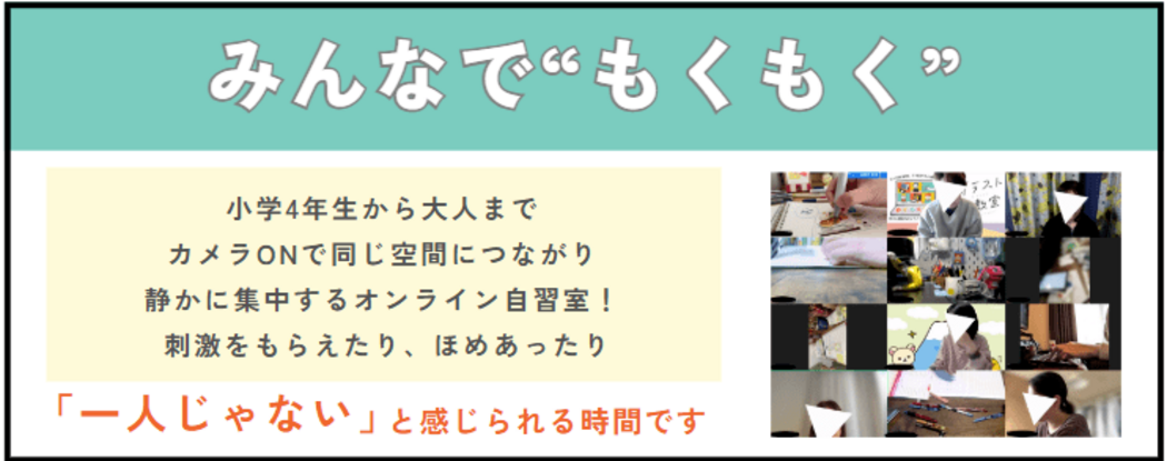 - Zoomでつながり、各自が勉強・仕事・読書などを"もくもく"と進めるオンライン自習室です。