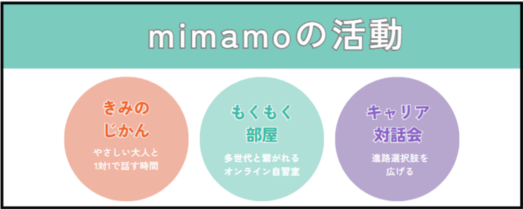 - mimamoは 「学習機会」「安心できる対話相手」「将来の選択肢」「多様性の尊重」 という4つの柱で、子どもたちが抱える複合的な課題にアプローチしています。