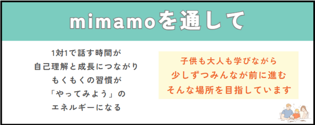 - 将来的にmimamoのメンターとして関わることも検討できるため、「子どもを支えたい」「想いをカタチにしたい」方におすすめのプログラムです。
