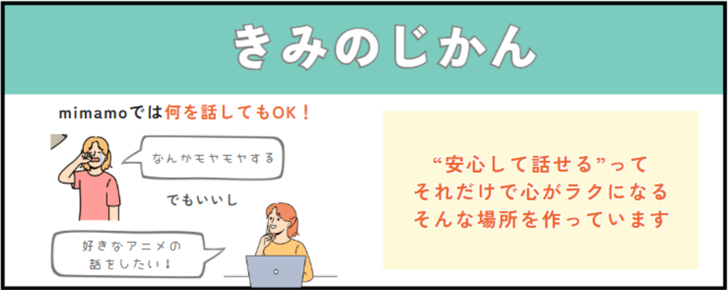 - 主に小学4年生から高校生を対象に、1対1のオンライン対話「きみのじかん」や、多世代交流型オンライン自習室「もくもく部屋」を運営しています。