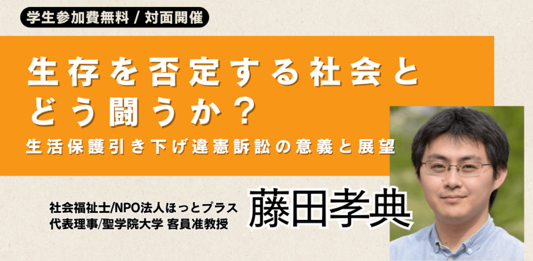 本イベントでは、藤田孝典さんに登壇いただき、6月27日についに最高裁判決の日を迎える生活保護引き下げ違憲訴訟の意義と展望について考えます。