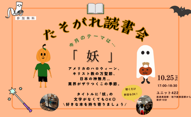受付は16時30分からです。読書会は17時スタート、18時30分終了予定です。 |