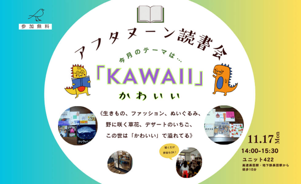 【11/17(月)14時~】紹介したい本(小説、画集や写真集、マンガや絵本など何でもOK)を持ち寄る読書会。会場は私設図書館ユニット422です(地下鉄長田駅最寄り)。参加費無料。初参加歓迎◎