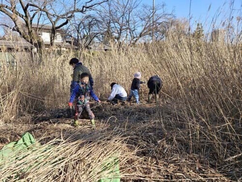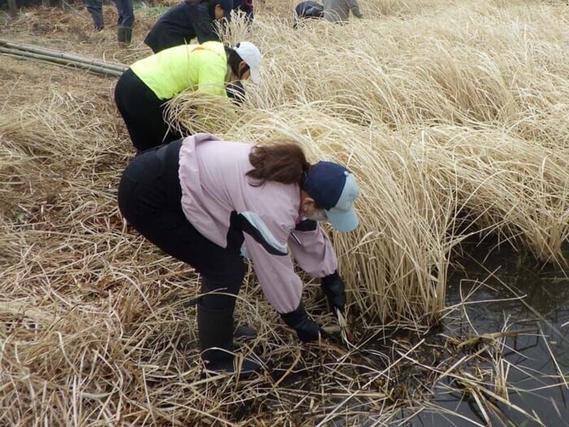 トンボや水鳥など、さまざまな生きものの生息環境を維持するために、ヨシやマコモを刈り取って湿地の陸化を防ぎましょう!