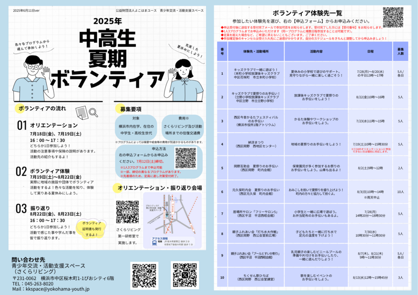 中高生の皆さん、今年の夏休みはボランティア体験をしませんか。申込みはグーグルフォームで受け付けます。(activoから直接申込むことはできません。)詳細はactivoからの返信メールをご確認ください。