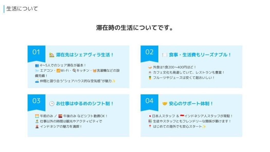 現地に日本人/インドネシア人スタッフ常駐。生活や業務の相談可。