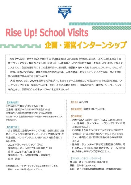 大阪YWCAでは若い女性が中心となって「Rise Up School Visits」というチームを結成し、中高生向けの「包括的性教育」ワークショップを企画・運営しています。