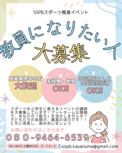 今後小学生や中学生の指導をする方にとってとても良い経験とスキルになると思います。皆様の教育に対する考え方や思いを実践していきませんか。年内に第一回目のイベントを開催する予定です。ご協力いただける方は何卒ご連絡いただけると嬉しいです。