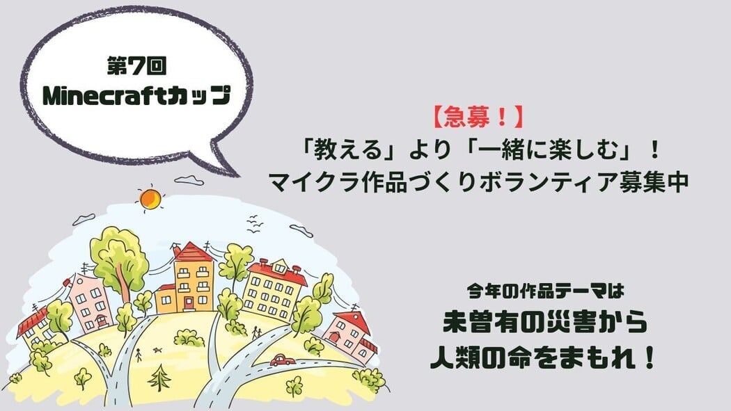 子どもたちが教育版マインクラフトで理想のまちや災害から守るたものをデザインする「マイクラカップ」への挑戦をサポートしてくれるボランティアを募集!創造力や伝える力を育む学びの場を、一緒に支えてください。
