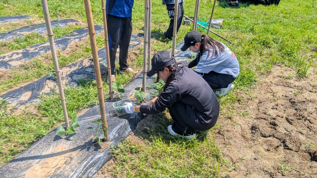 【畑事業】地域で土地をお借りして農業体験を行っています。春先に夏野菜とさつまいもを子どもたち植え、収穫を行います。自分たちで育てた野菜を収穫すし食すまでが体験活動になっています・食育夏野菜が終われば冬野菜栽培を行います。