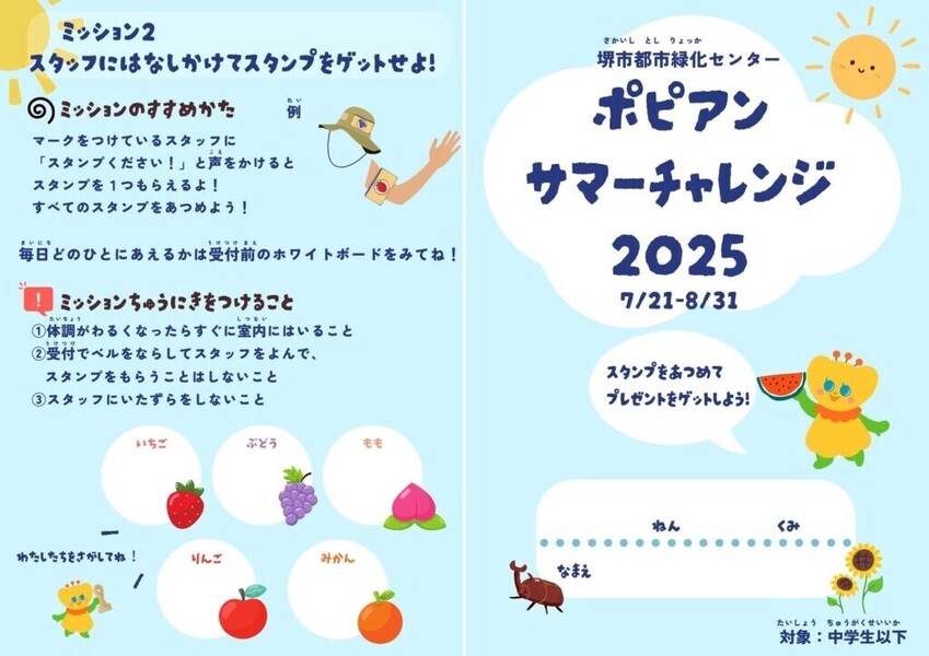 堺市都市緑化センターでは、ミッションに参加してスタンプを集めるとプレゼントがもらえる、「ポピアンサマーチャレンジ」を開催します。