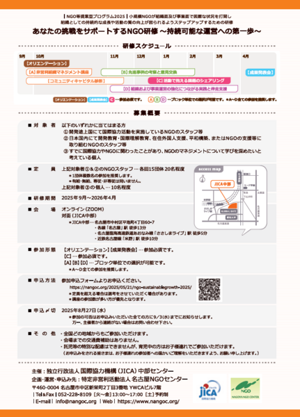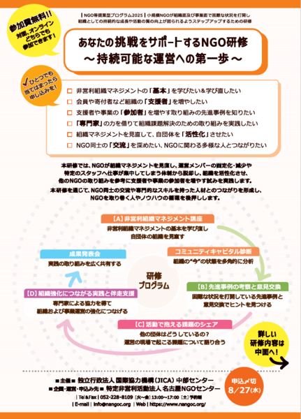 このたび名古屋NGOセンターでは、JICAが提供するNGO等提案型プログラムを活用し、組織としての持続的な成長や活動の質の向上を図るための研修を実施することとなりました。