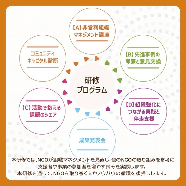 NGOが組織マネジメントを見直して組織の活性化をめざし、他のNGOの取り組みを参考に支援者や事業の参加者を増やす取り組みを実践します。