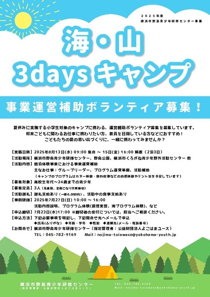 横浜市野島青少年研修センターにて実施する2泊3日の宿泊体験事業『海・山3daysキャンプ』において、事業の運営に携わる運営補助ボランティアを募集しています!
