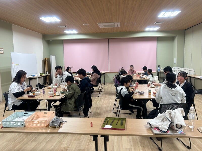 学習の途中に夕食タイムあり。手作りのおいしいご飯をみんなで食べることも大切にしています!初心者も大歓迎!