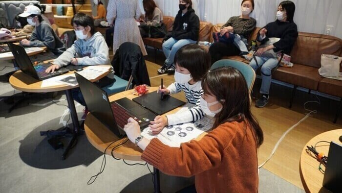 イベント中は子供たちや先生達とワイワイ楽しくレクチャーして、休憩中も皆で会話しながら作業などをしています!